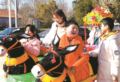 2月18日,大学生在陪伴留守儿童骑毛驴跑旱船。寒假期间,山东大学管理学院大二学生徐颖等14名大学生牵手当地35名留守儿童,开展爱党爱国教育等活动,让留守儿童快乐度寒假。