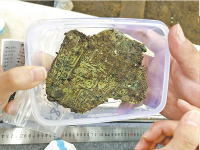 8号坑出土的青铜容器残片,纹饰精美繁复。