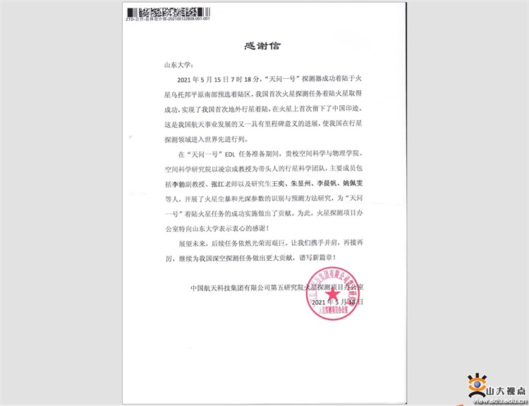 近日,航天科技集团有限公司第五研究院火星探测项目办公室致信山东大学,感谢山东大学行星科学团队为“天问一号”火星探测器成功着陆任务作出的贡献。