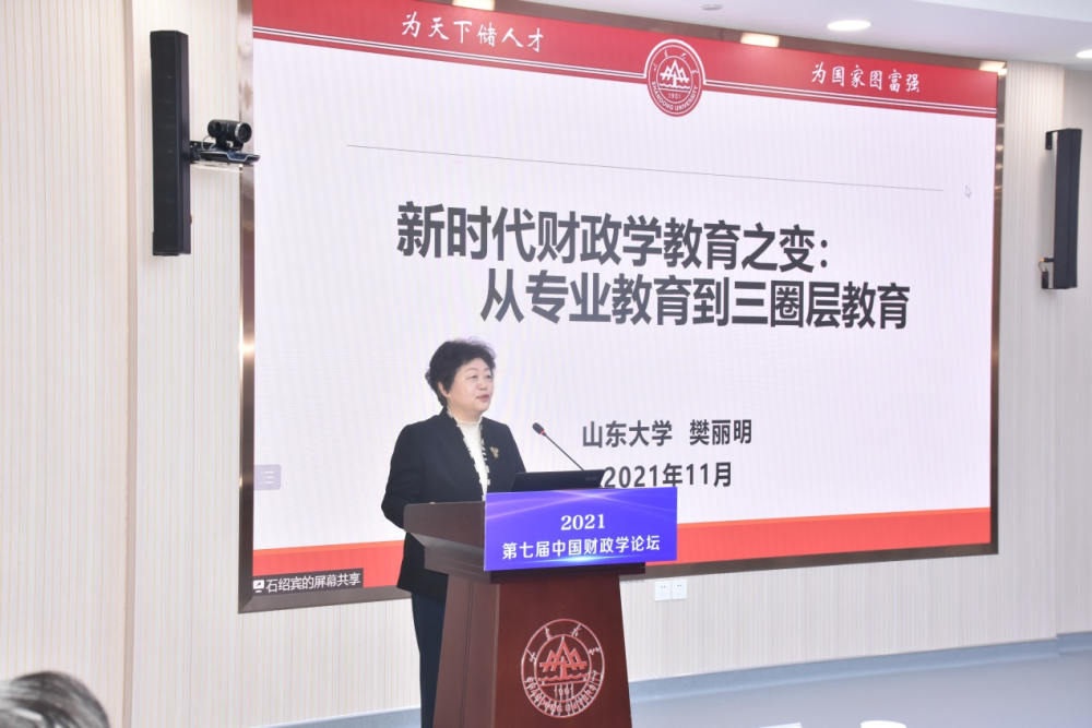 本届论坛由山东大学经济学院、经济研究杂志社、山东省公共经济与公共政策研究基地和山东大学公共经济与公共政策研究中心共同主办。论坛主席、山东大学校长樊丽明教授做了题为“新时代财政学教育之变:从专业教育到三圈层教育”的报告。报告分析了新时代财政学教育之变的逻辑,认为在两个百年交会点上,财政学教育也应发生时代之变,并提出新时代应当构建财政学“专业教育、通识教育、社会教育”三圈层教育体系。