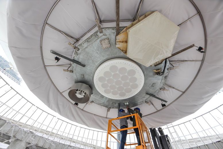 2021年12月17 日,工作人员对“中国天眼”的馈源舱进行维护保养 欧东衢 / 摄