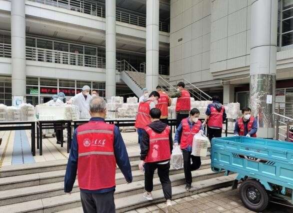 食堂接餐、运送到宿舍楼、核实数据、楼下分餐、上楼送餐。学生宿舍楼数量多、分布广,有的宿舍楼没有电梯。学校校长、书记亲自带头,各学院驻校区的书记、院长、老师专家,都亲自上阵,努力以最快的速度将饭菜送到同学们的手中。