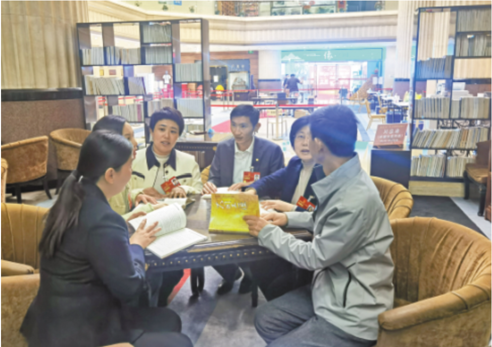 3月5日,参加十四届全国人大一次会议的山东代表团部分代表利用休息时间阅读并分享心得。山东代表团 供图