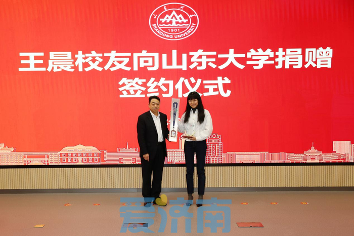 仪式上,芦延华与王梦迪共同签署了捐赠协议,郭新立向王梦迪颁发捐赠证书,陈玉国赠送“山东大学齐鲁医院终身职工”水晶铭牌及职工卡。