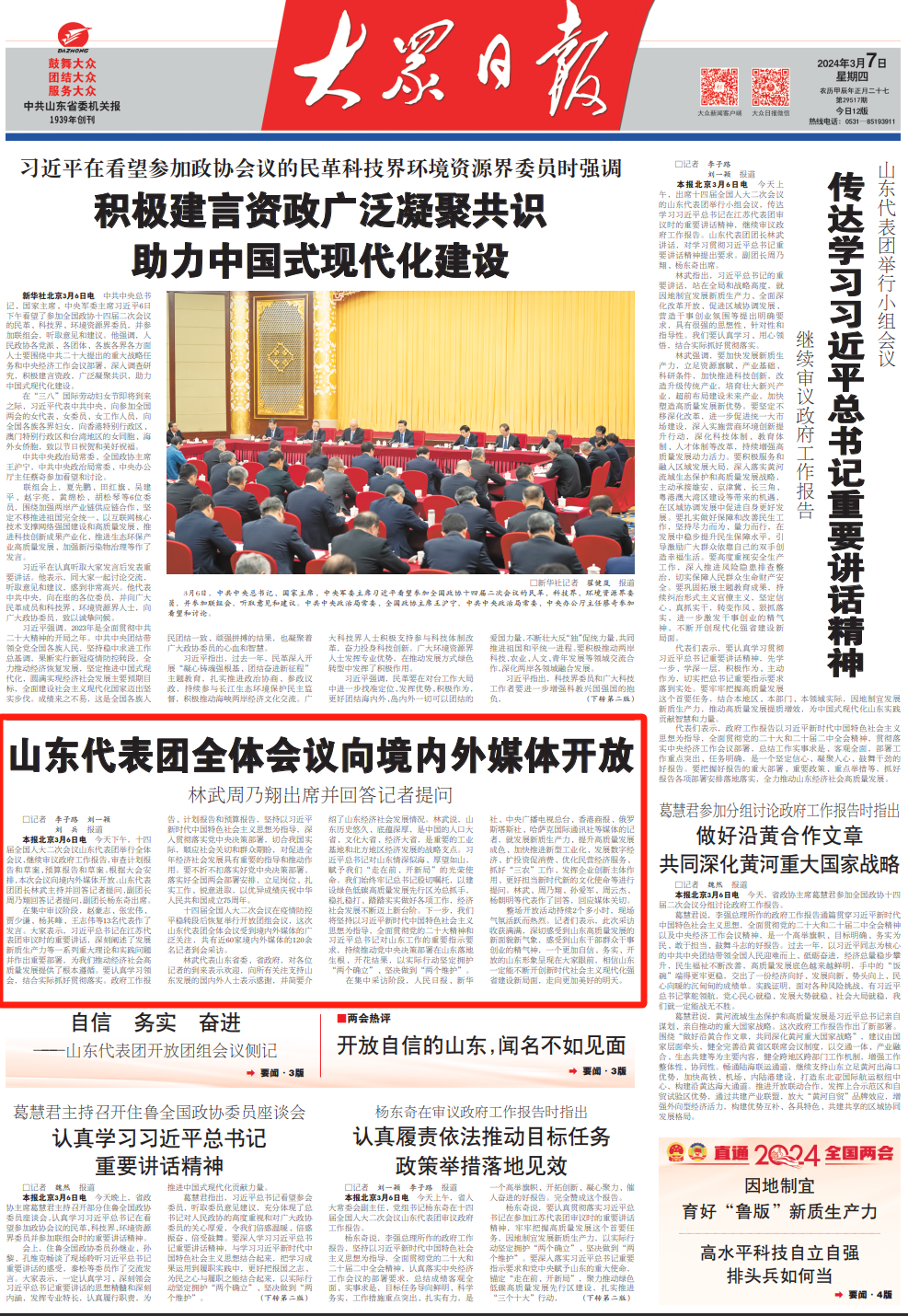 本报北京3月6日电 今天下午,十四届全国人大二次会议山东代表团举行全体会议,继续审议政府工作报告,审查计划报告和草案、预算报告和草案。根据大会安排,本次会议向境内外媒体开放。山东代表团团长林武主持并回答记者提问,副团长周乃翔回答记者提问,副团长杨东奇出席。