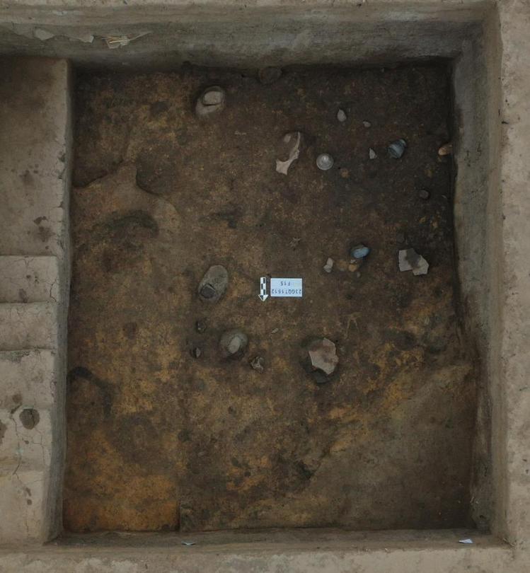 战国时期的一处台基是此次发掘的重要收获,该台基大致呈圆形,面积达780平方米。因历代耕作取土,台基顶部地面部分已被削去,从对残存的地下基坑解剖情况来看,筑造过程是先开挖1.5米以上深度的大型圆坑,坑底经过整平,填土取自外围黄色生土以及遗址外围壕沟中的黑色或青灰色淤土,以倾斜土层铺垫并经压实或简单夯打的方式填平基坑。与台基大致同时期的灰坑、灰沟内,出土大量动物骨骼和制作精致的暗纹陶器等遗物;台基南侧约2米处,有一座一次性填埋7人的人牲坑,经鉴定为青壮年阶段的4男2女以及一位未成年;台基西南侧一口水井的近底部填土中,发现一件器形硕大的陶甑,复原后口径120厘米、高90厘米。考古队认为这两处迹象很可能都与圆形大台基有关,反映的都是重要的祭祀活动。