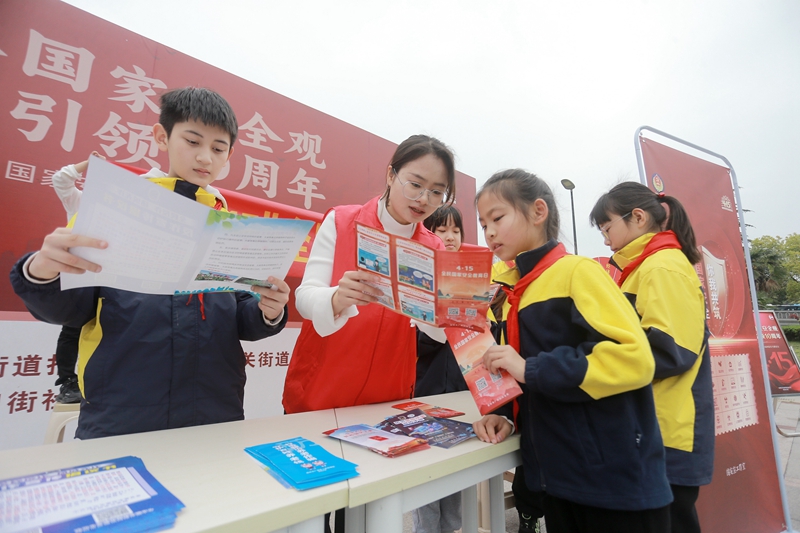 4月12日,江苏省扬州市徐凝门街社区的志愿者向小学生们讲解国家安全知识。