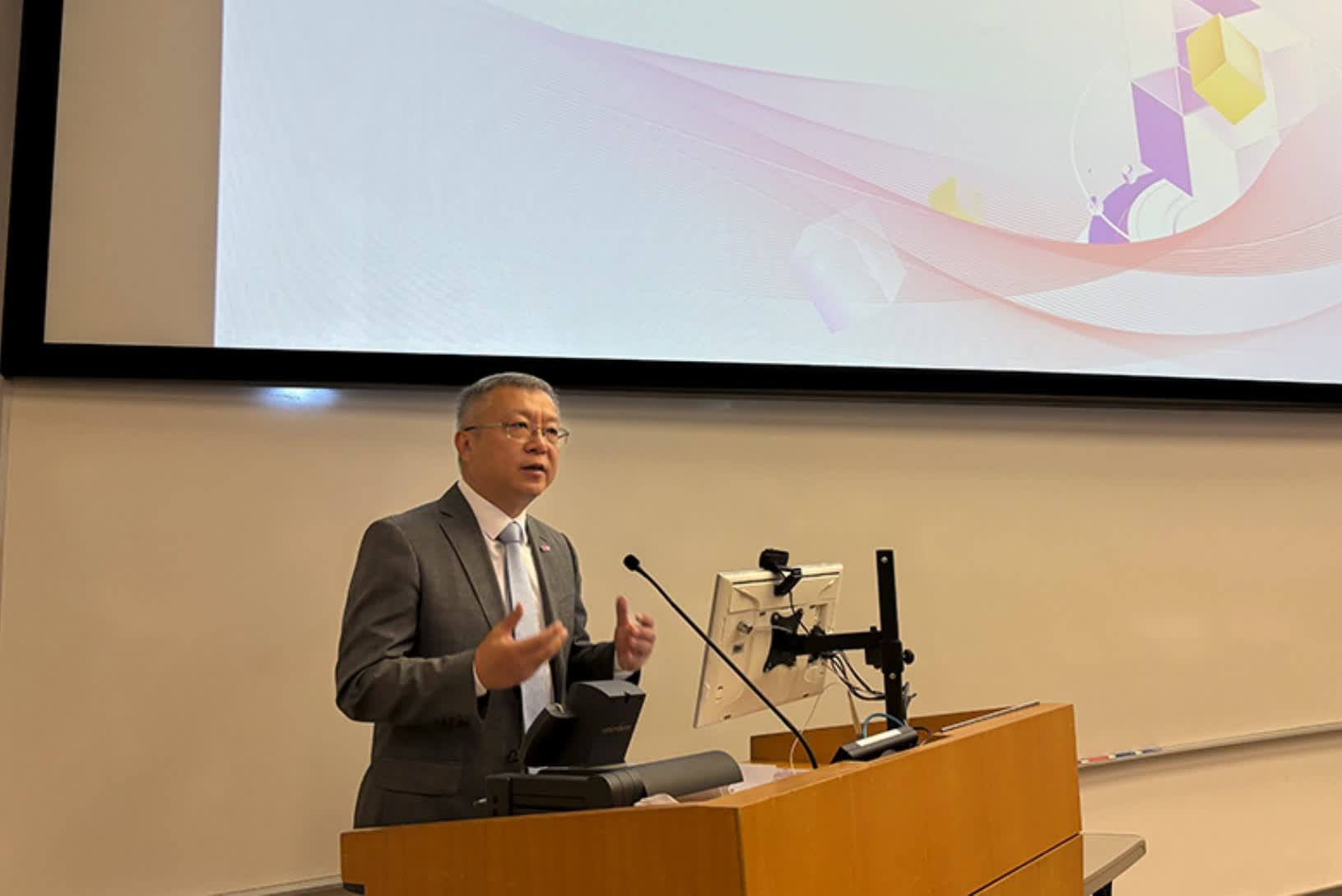 多名鲁港两地学者参与了今日活动的科技创新成果交流环节,其中香港大学讲座教授周中军以「衰老疫苗:老年相关疾病的创新疗法」进行了主题报告,香港理工大学讲座教授王立秋则分享了其「微纳结构软制造」研究。