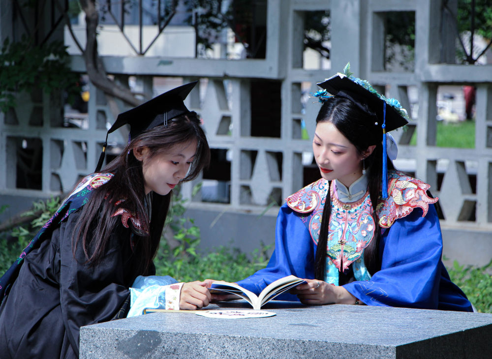 山东大学历史学院硕士毕业生姜艺(右)身穿云肩拍摄毕业照(资料照片)。新华社发