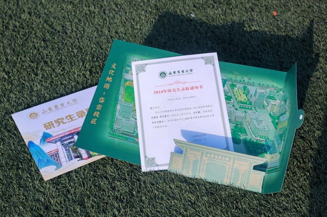 打开录取通知书,标志性的学校校门和岱宗校区的地图映入眼帘。一笔一划、一草一木之间,展现的是山东农业大学自然之美与学术氛围,流淌的尽是菁菁校园的美好年华,兼具艺术性与仪式感,象征着欢迎2024级新生来到山东农业大学的知识殿堂。