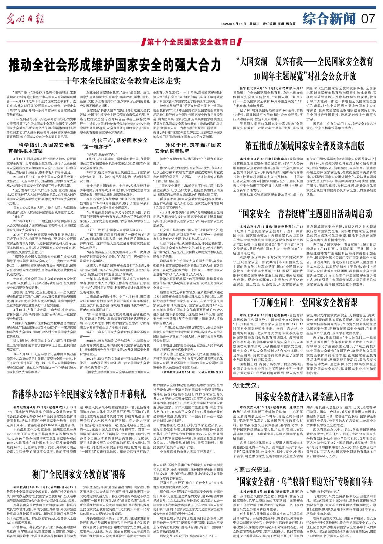 据了解,除录制播出“千万师生同上一堂国家安全教育课”,今年教育部思想政治工作司还指导中国大学生在线重点建设了“聚焦高校大学生国家安全教育”官网平台,集聚历年全民国家安全教育日的活动专题,汇聚国家安全教育精品课程资源,发布高校工作动态,展示各高校特色活动成果,通过多种形式引导高校师生全面提升国家安全意识,掌握国家安全相关知识和技能。