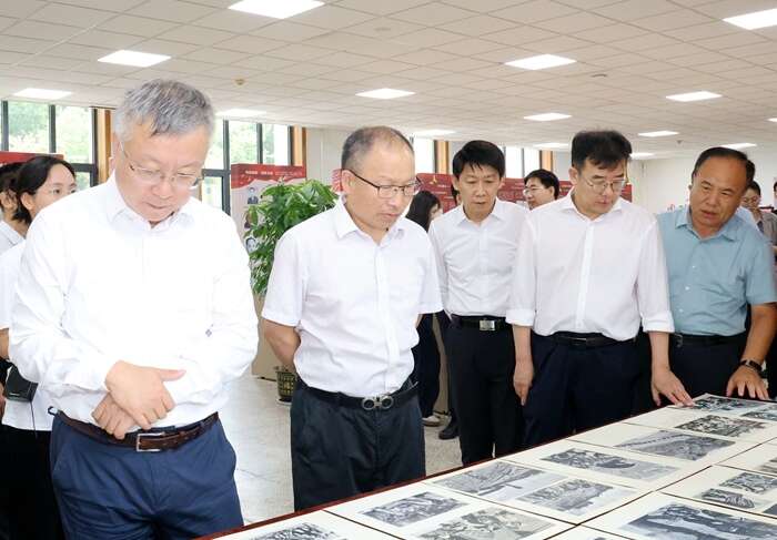 山东大学党委书记任友群,副校长易凡,党委常委、宣传部部长张帅等校领导参观文献展。(山东大学供图)