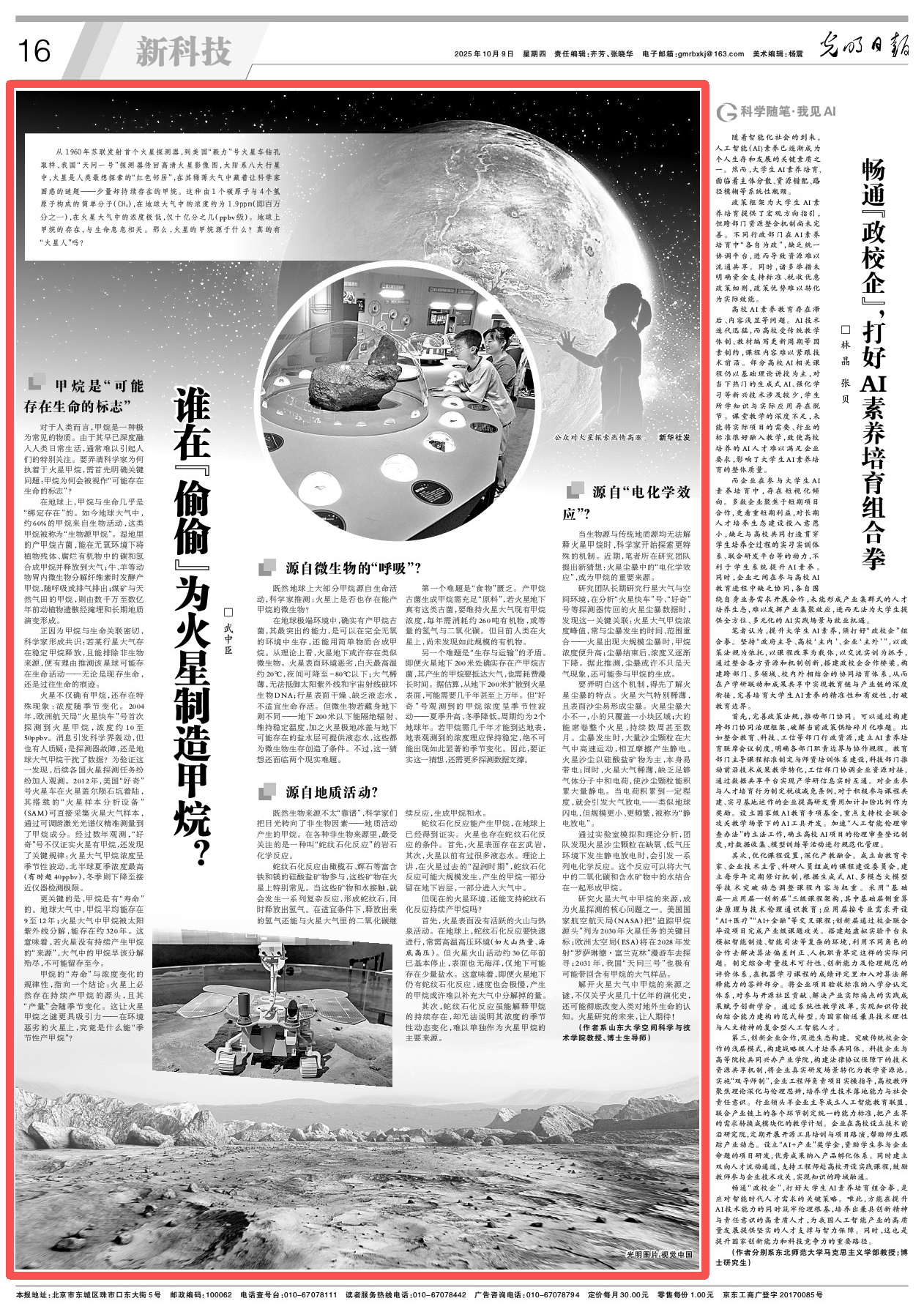 研究火星大气中甲烷的来源,成为火星探测的核心问题之一。美国国家航空航天局(NASA)把“追踪甲烷源头”列为2030年火星任务的关键目标;欧洲太空局(ESA)将在2028年发射“罗萨琳德・富兰克林”漫游车去探寻;2031年,我国“天问三号”也极有可能带回含有甲烷的大气样品。