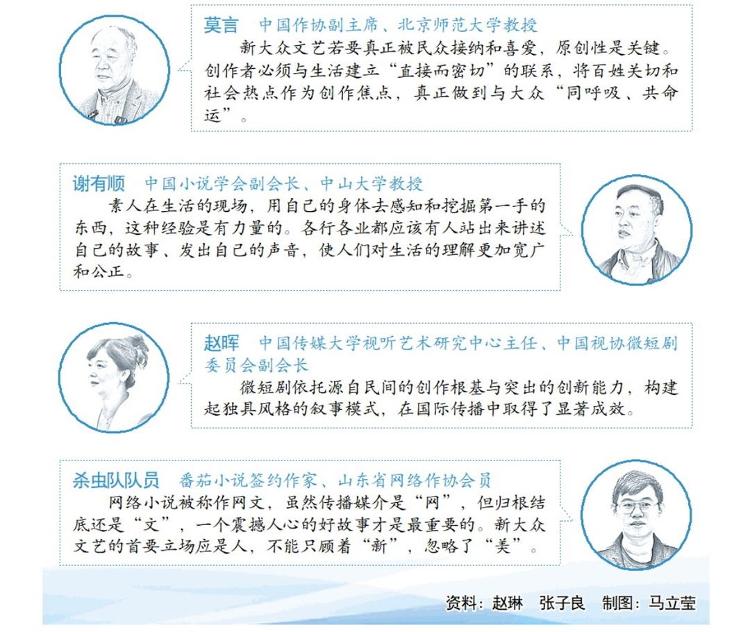 “新大众文艺”这一概念是基于媒介技术变革的角度提出的。山东网络作家杀虫队队员认为,网络小说被称作网文,虽然传播媒介是“网”,但归根结底还是“文”,一个震撼人心的好故事才是最重要的。“新大众文艺的首要立场应是人,不能只顾着‘新’,忽略了‘美’。”