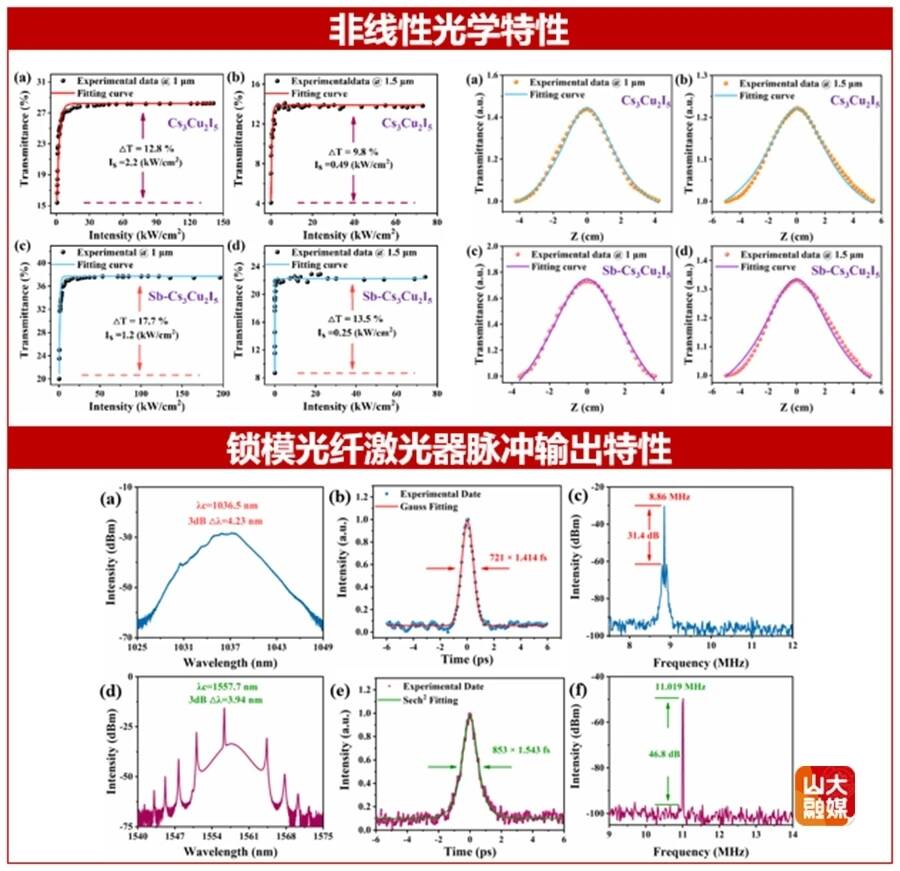 图2.Sb3+掺杂Cs3Cu2I5SA的非线性光学特性以及锁模脉冲输出特性