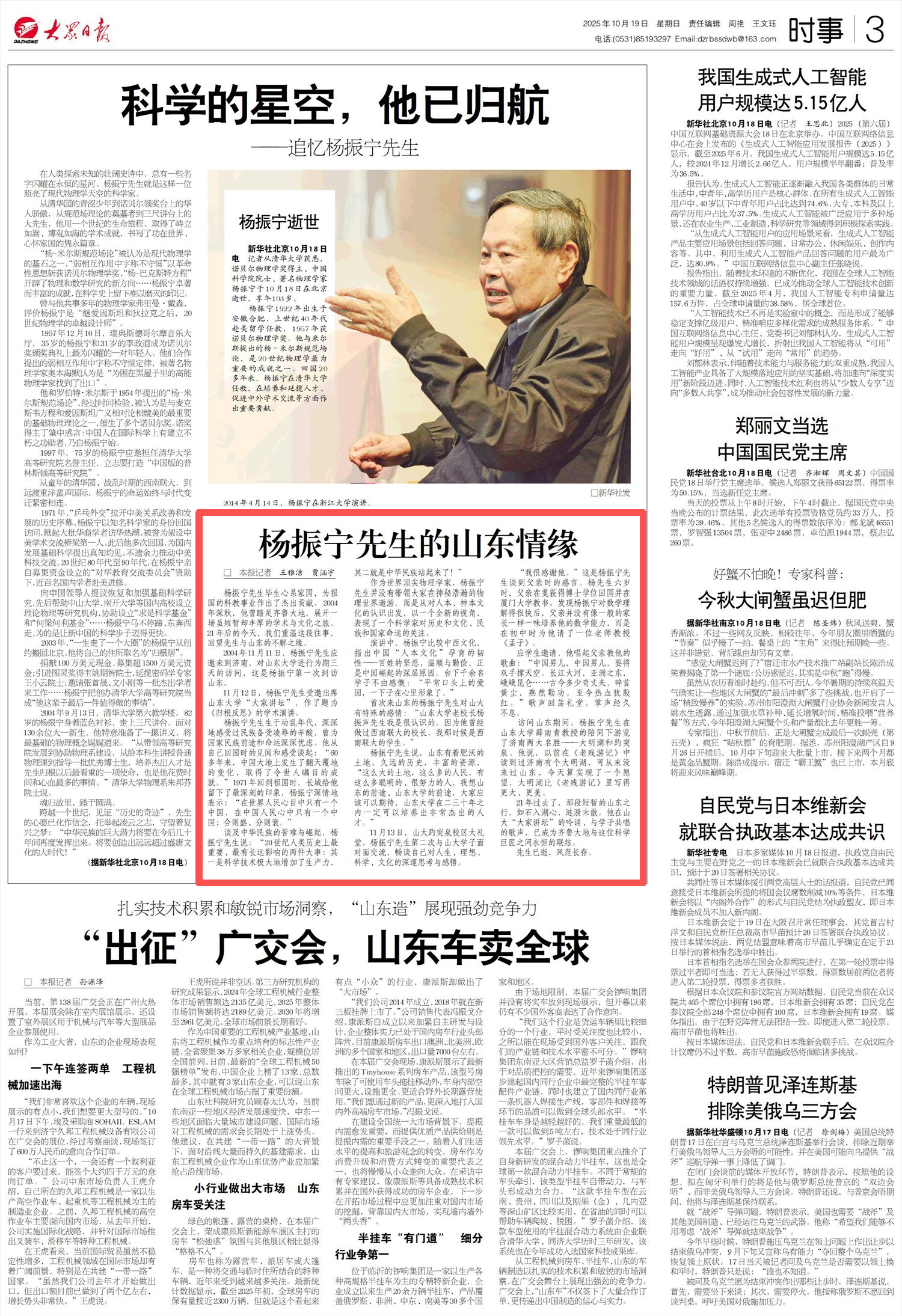 杨振宁先生毕生心系家国,为祖国的科教事业作出了杰出贡献。2004年深秋,他曾踏足齐鲁大地,展开一场虽短暂却丰厚的学术与文化之旅。21年后的今天,我们重温这段往事,回望先生与山东的不解之缘。