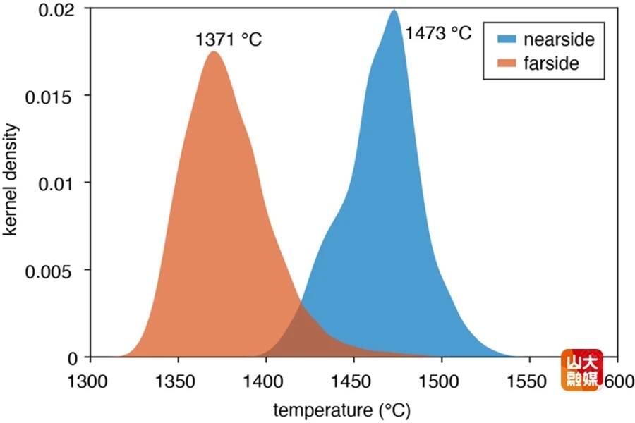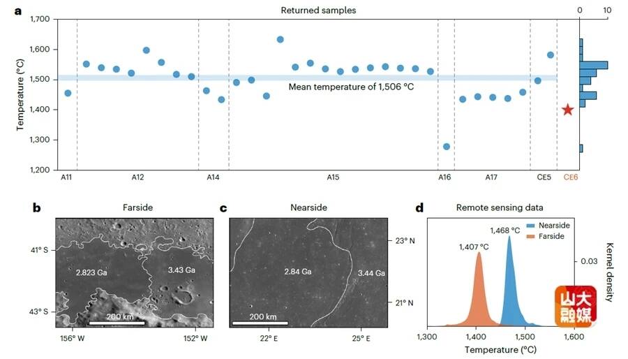 研究团队测定嫦娥六号玄武岩的结晶温度约为1100摄氏度,相较于月球正面的玄武岩结晶温度偏低约100摄氏度,这说明月球背面的月幔在产生这些玄武岩浆时可能相对于正面更冷。为了获得反映月球正面与背面月幔温度差异的直接证据,研究团队还利用玄武岩成分计算了月幔潜能温度。将来自月球正面的嫦娥五号和阿波罗计划返回的玄武岩与嫦娥六号玄武岩对比,发现月球背面月幔潜能温度(~1400摄氏度)低于月球正面(~1500摄氏度)。