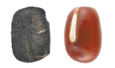小高遗址出土的炭化小豆(左)与现代小豆(右)。 陈雪香供图 |