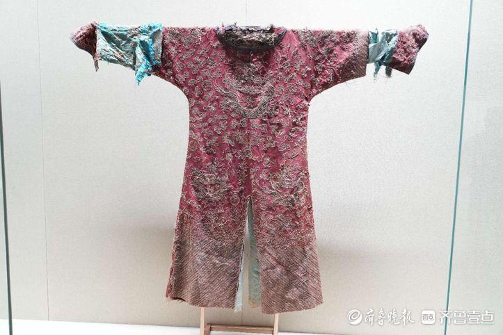 山东省文物保护修复与鉴定中心工作人员介绍,赫士袍服是一件“绛色绸平金绣云龙纹蟒袍”,款式为大襟马蹄袖通身式袍,通身采用盘金绣,金线主要使用捻金线和捻银线。