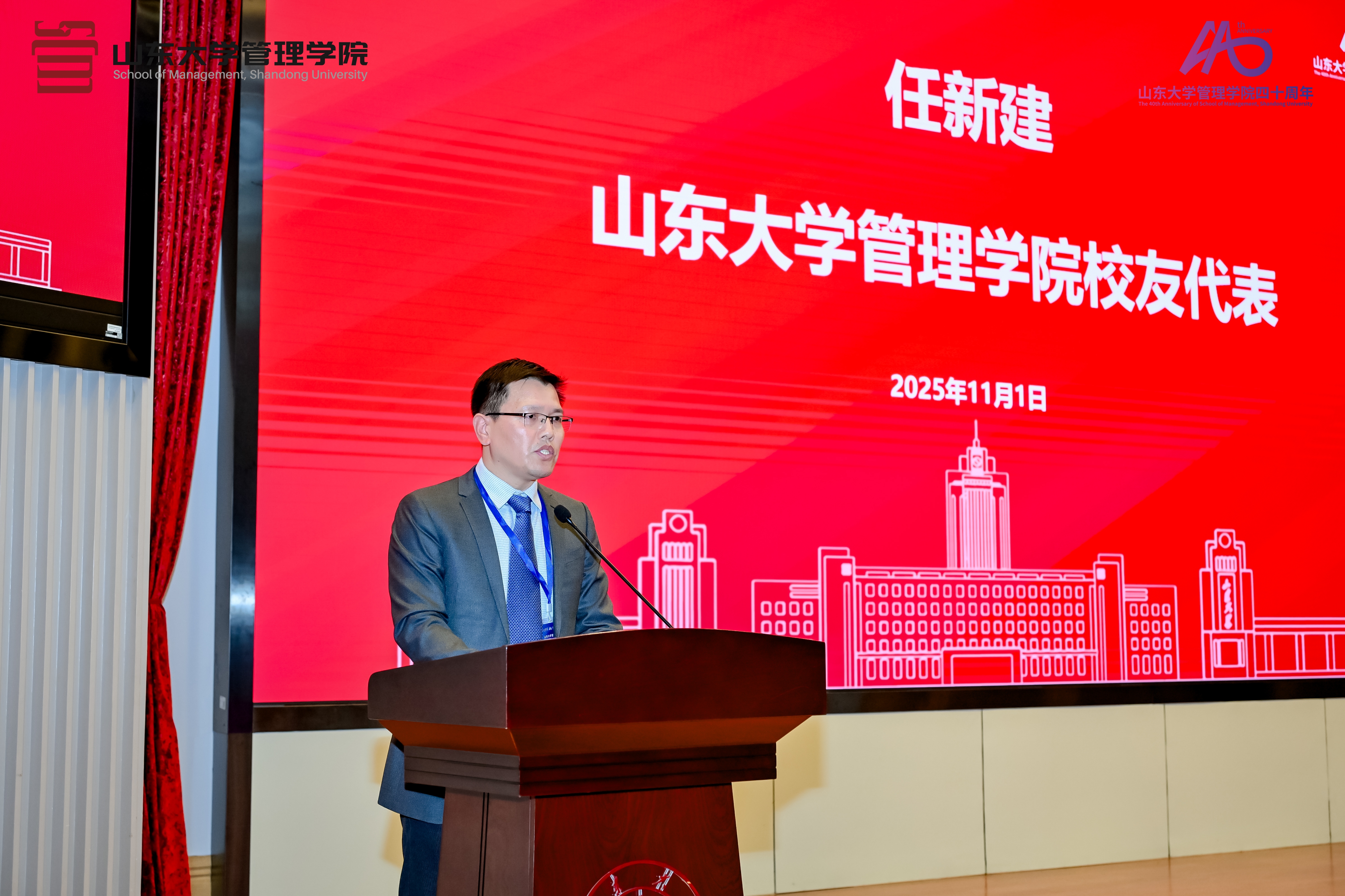 任新建致敬了学院四十年的发展成就。他说,山东大学“学无止境,气有浩然”的校训已融入血脉,管理学院是梦想的起点,更是塑造人生观、价值观、世界观的精神家园。他表示,老师们用严谨治学态度和高尚人格魅力为学子竖立了胸怀天下、勇于担当的人生向导,这些来自管院的烙印,成为了他创业路上的宝贵财富。最后,他代表全体校友祝愿母院再谱华章。