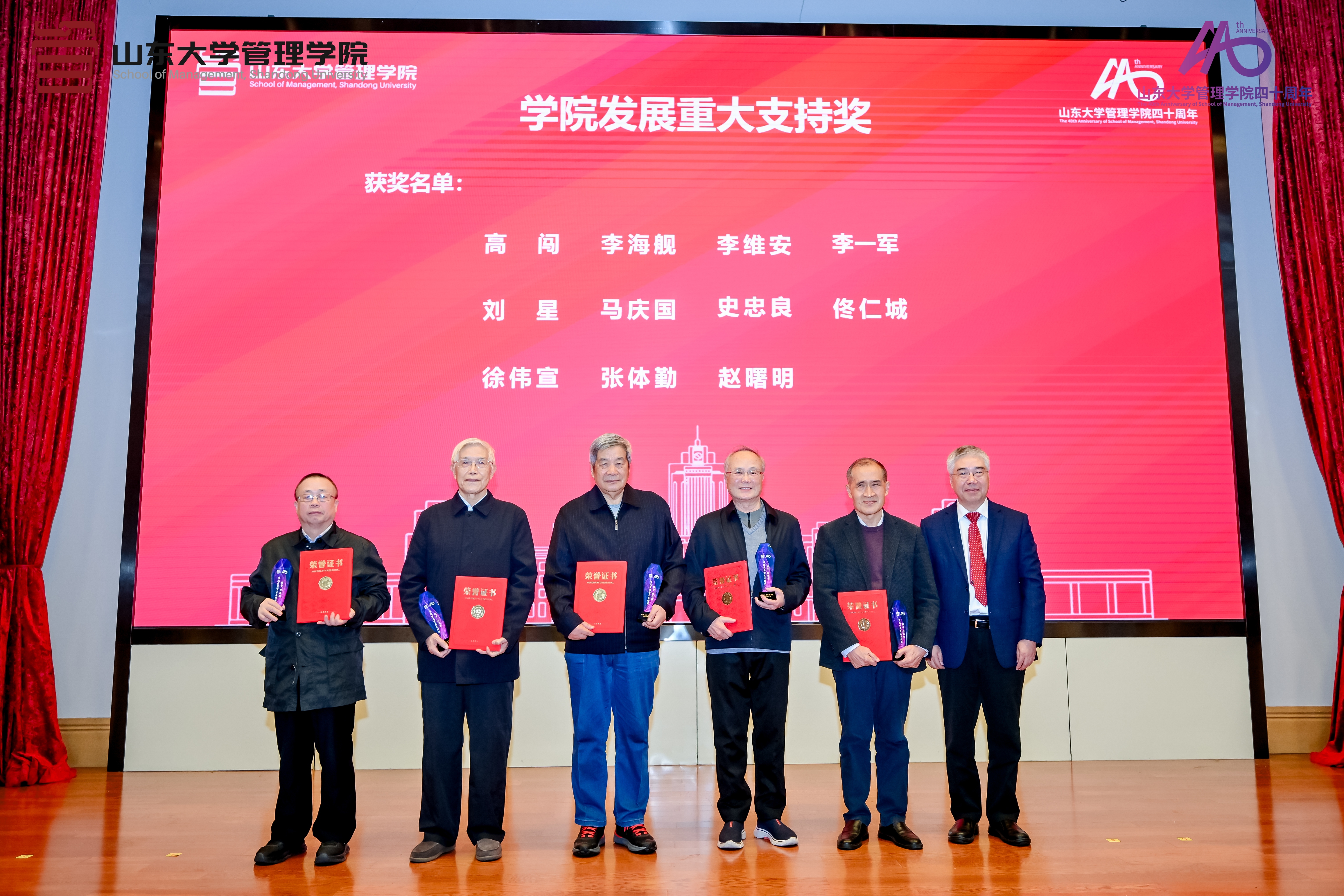 岁月不居,时节如流;是管院教师用担当与智慧破解难题,见证了从40年来从青涩走向成熟的管理学院。群策群力,同舟共济;是学界同仁以协同创新之力为帆,为未来征程汇聚动能。同心如炬,照亮前路;是合作企业为学院建设注入活水、搭建平台。会上,李向阳、丁荣贵和学院党委书记付岩志分别为推动学院事业发展的教师、学界与企业代表颁发了“学院发展突出贡献奖”“学院发展重大支持奖”及“学院发展同心协力奖”。