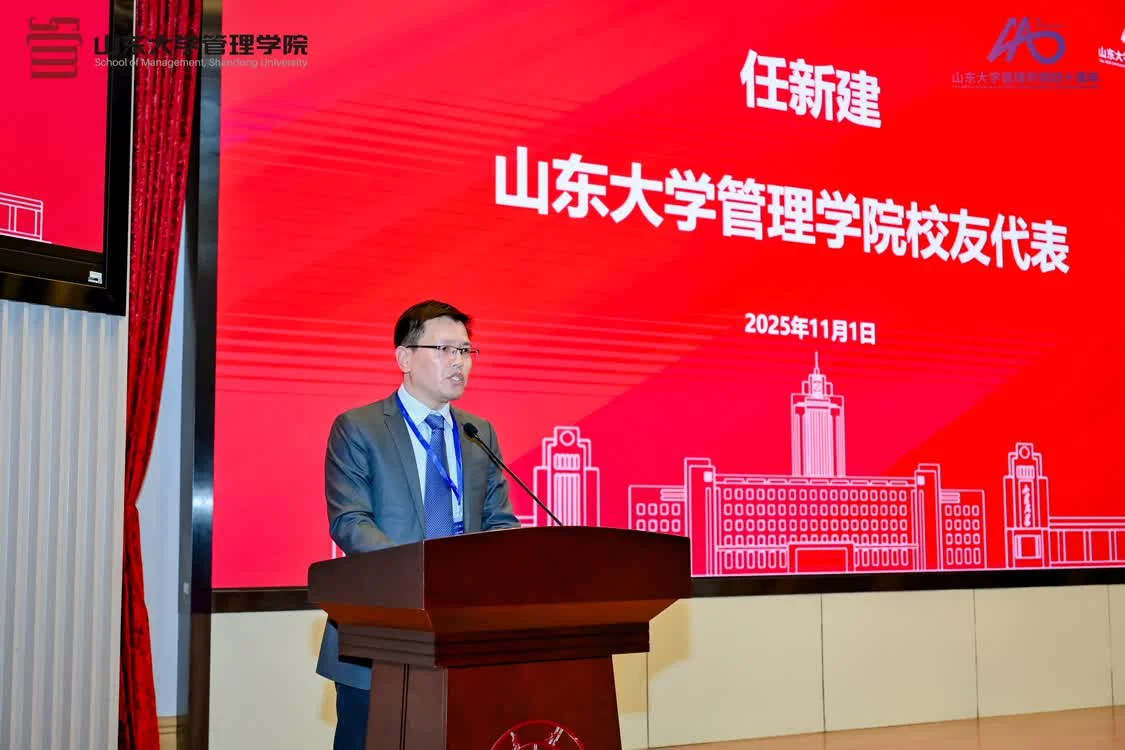 任新建致敬了学院四十年的发展成就。他说,山东大学“学无止境,气有浩然”的校训已融入血脉,管理学院是梦想的起点,更是塑造人生观、价值观、世界观的精神家园。他表示,老师们用严谨治学态度和高尚人格魅力为学子竖立了胸怀天下、勇于担当的人生向导,这些来自管院的烙印,成为了他创业路上的宝贵财富。最后,他代表全体校友祝愿母院再谱华章。