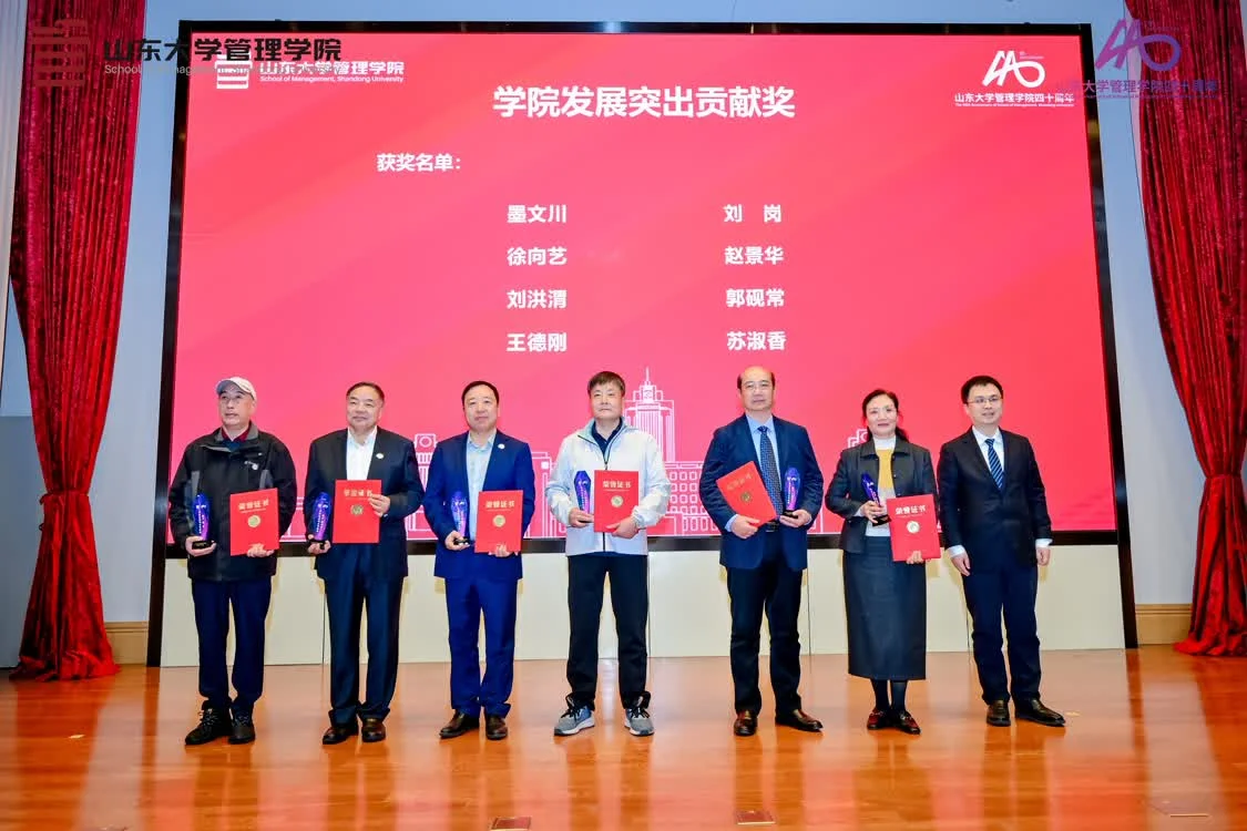 岁月不居,时节如流;是管院教师用担当与智慧破解难题,见证了从40年来从青涩走向成熟的管理学院。群策群力,同舟共济;是学界同仁以协同创新之力为帆,为未来征程汇聚动能。同心如炬,照亮前路;是合作企业为学院建设注入活水、搭建平台。会上,李向阳、丁荣贵和学院党委书记付岩志分别为推动学院事业发展的教师、学界与企业代表颁发了“学院发展突出贡献奖”“学院发展重大支持奖”及“学院发展同心协力奖”。