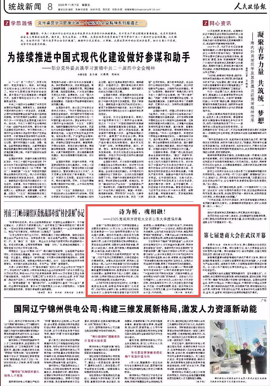 此次大会精心设置三大议题——“两岸诗歌写作与诗学研究”“AI时代的诗歌创作与批评”“中国诗学的现代转化与发展”,打破学科壁垒,让诗学理论与创作实践“双向奔赴”。这场由九州文化传播中心、山东大学主办,山东大学人文艺术研究院、诗学高等研究中心及九州出版社承办的盛会,不仅是一次诗意的相聚,更是一股为两岸文化交流注入的滚烫力量,让中华诗魂在海峡两岸生生不息、代代相传。