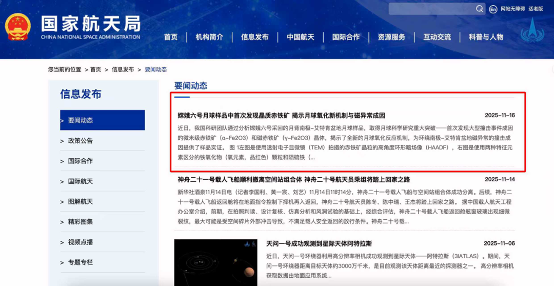 月球表面长期以来被认为是高度还原的环境。由于缺乏大气和水,月球上的铁元素通常以零价(金属铁)或二价形式稳定存在,科学界普遍认为月球几乎不可能形成赤铁矿等强氧化性矿物。然而,嫦娥六号从月球南极-艾特肯盆地(太阳系最大、最古老的撞击盆地)带回的月壤样品,彻底改变了这一认知。