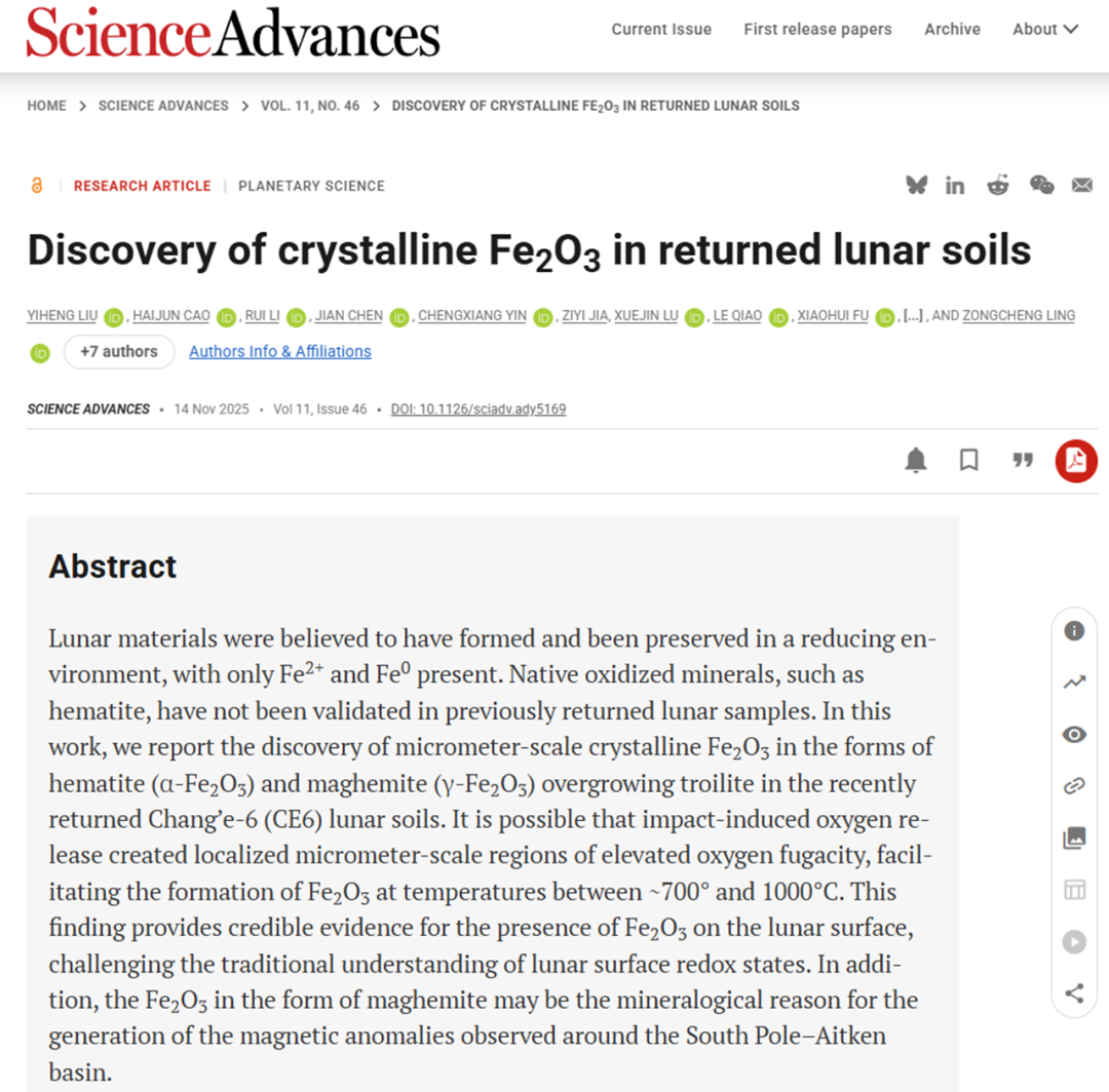 这一突破性成果以《Discovery of crystalline Fe₂O₃ in returned lunar soils》为题,于2025年11月14日发表在国际顶级期刊《Science Advances》(中科院一区TOP期刊,影响因子12.5)。该研究由山东大学、中国科学院地球化学研究所和云南大学的联合团队完成,山东大学为论文第一完成单位。论文第一作者为山东大学博士研究生刘毅恒、博士后曹海军和中国科学院地球化学研究所特聘高级工程师李瑞,联合通讯作者为山东大学凌宗成教授、中国科学院地球化学研究所李阳研究员和山东大学陈剑助理研究员。