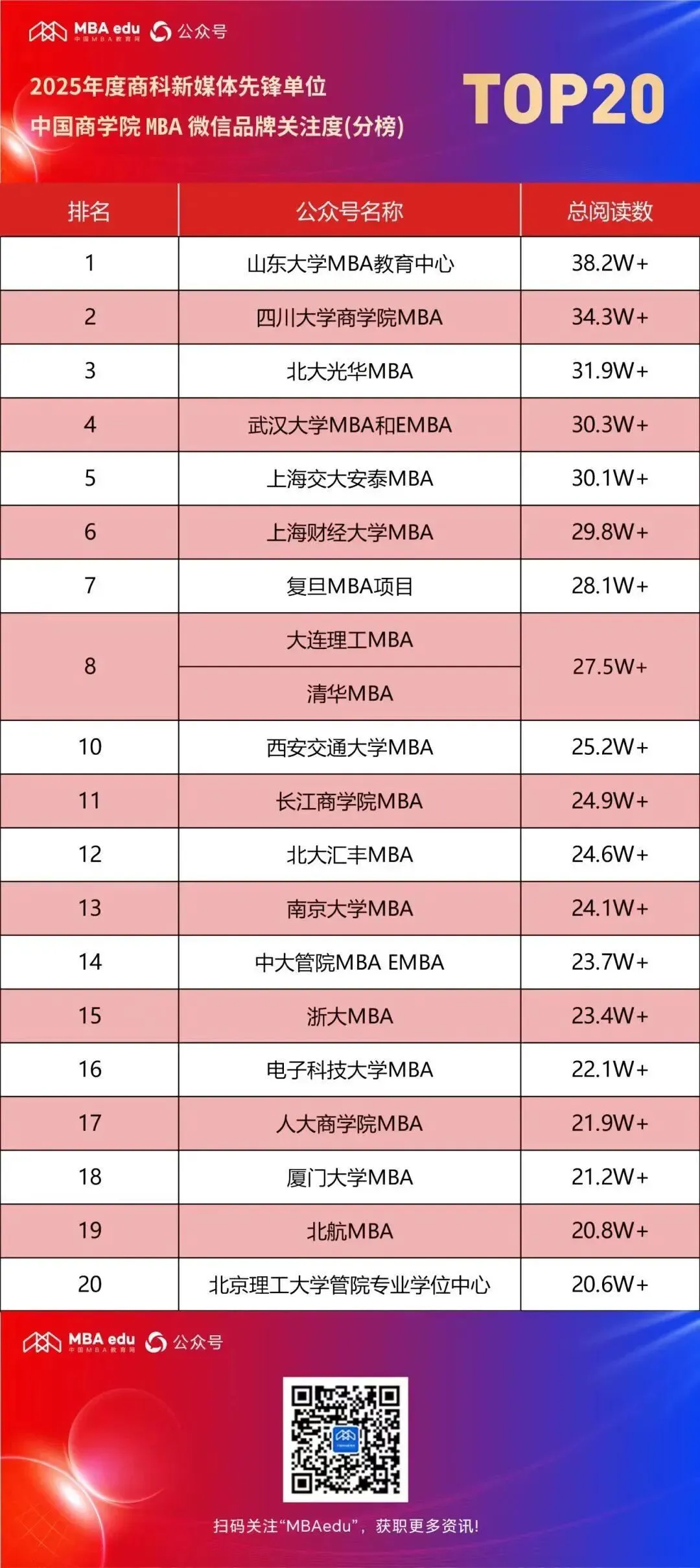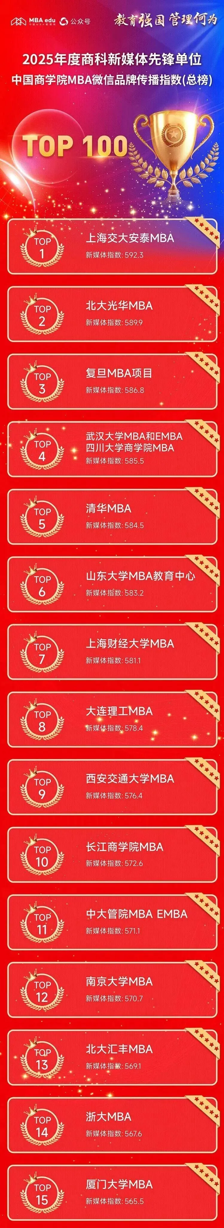 “山东大学MBA教育中心”微信公众号聚焦商科教育,展示项目风采,在内容、互动、风格等方面不断加强创新投入,持续输出优质内容,在“中国商学院MBA微信品牌传播指数TOP100”榜单中跻身前十,位列第6位,荣获“2025年度商科新媒体先锋单位”,在“微信品牌关注度(分榜)TOP20”榜单中位列第1位。