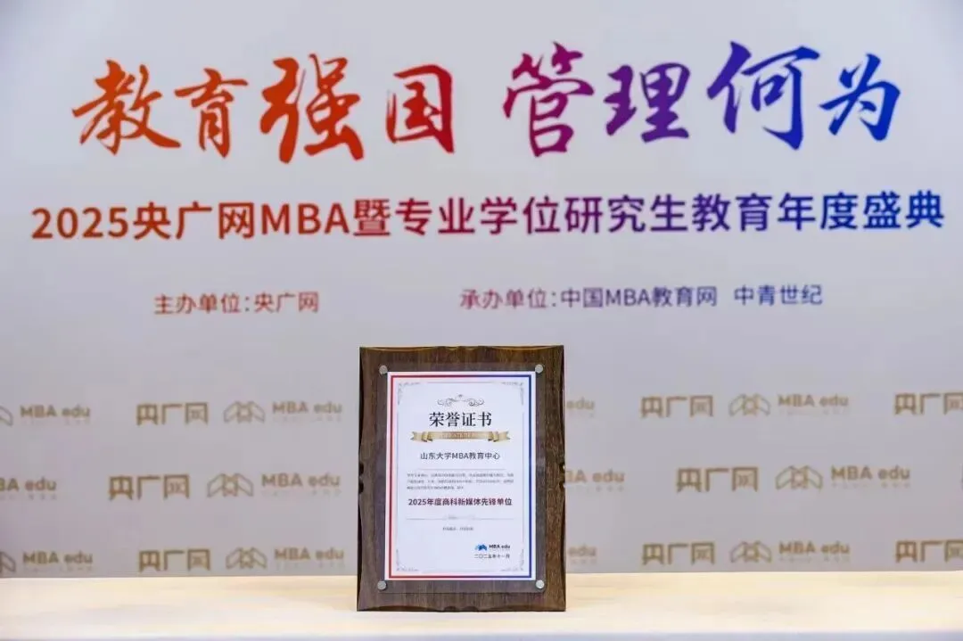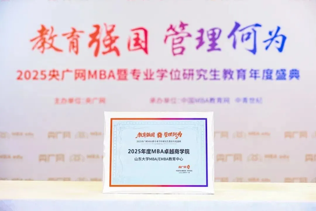山东大学MBA/EMBA教育中心凭借优质的教学水平、强大的师资力量和全面的人才培养,始终干在实处、走在前列,以其卓越的管理智慧与深刻的洞见,为中国经济发展和社会进步注入了强劲动力,荣获“2025年度MBA卓越商学院”。