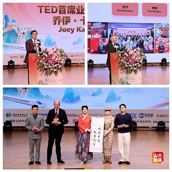 如何让中国故事直抵人心?TED首席业务发展官乔伊·卡托纳(Joey Katona),中国政府“友谊奖”获得者、厦门大学美籍教授、“用英语讲中国故事”形象大使潘维廉((Dr。 William N。 Brown),大会首席学术顾问、中国国创会中国故事研究院副院长、英国学者斯明诚(David Symington)结合亲身经历,生动诠释了文化传播的魅力。山东大学本科生王梓鉴、硕士研究生温棋、印度尼西亚留学生陈彩祎共同发出“我为中国故事代言”的倡议,号召广大青年学子以世界语言讲述新时代的中国。