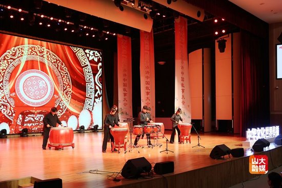 山东大学学生带来鼓乐表演《龙腾虎跃》和诵读节目《乐学明理,继往开来》。