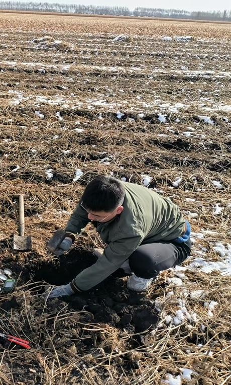 刘春柱在黑土地的定位试验点取土样,用于检测分析。受访者供图