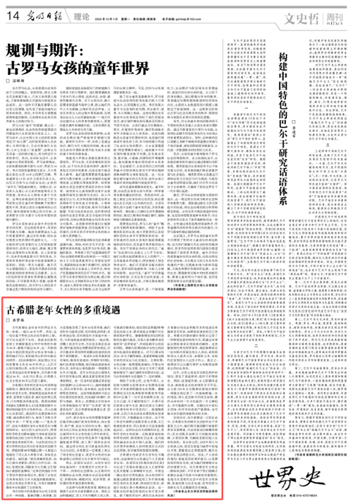 总体而言,在古希腊这一父权社会中,古希腊女性的晚年生活始终处于多重张力之中:她们既可能因履行家庭职责而受到尊重,亦会因衰老而被嘲笑排斥;其生活既有法律与习俗提供的保障,又常因丧偶、无嗣或贫困而陷入生存性危机。而女性公民、女性外邦人与女奴隶之间,因其在家庭与城邦中的地位不同,掌握的社会资源迥异,晚年生活亦呈现出明显分化。因此,个人层面的规划、家庭层面的照护意识,以及群体间的相互支持,成为她们保障晚年生活的重要方式。对古希腊老年女性这一群体的剖析,不仅有助于我们理解古希腊社会基于性别与年龄的双重规训,也能为反思现代社会中的老年女性保障、家庭伦理与社会处境,思考性别与老龄化交叉议题提供历史镜鉴。