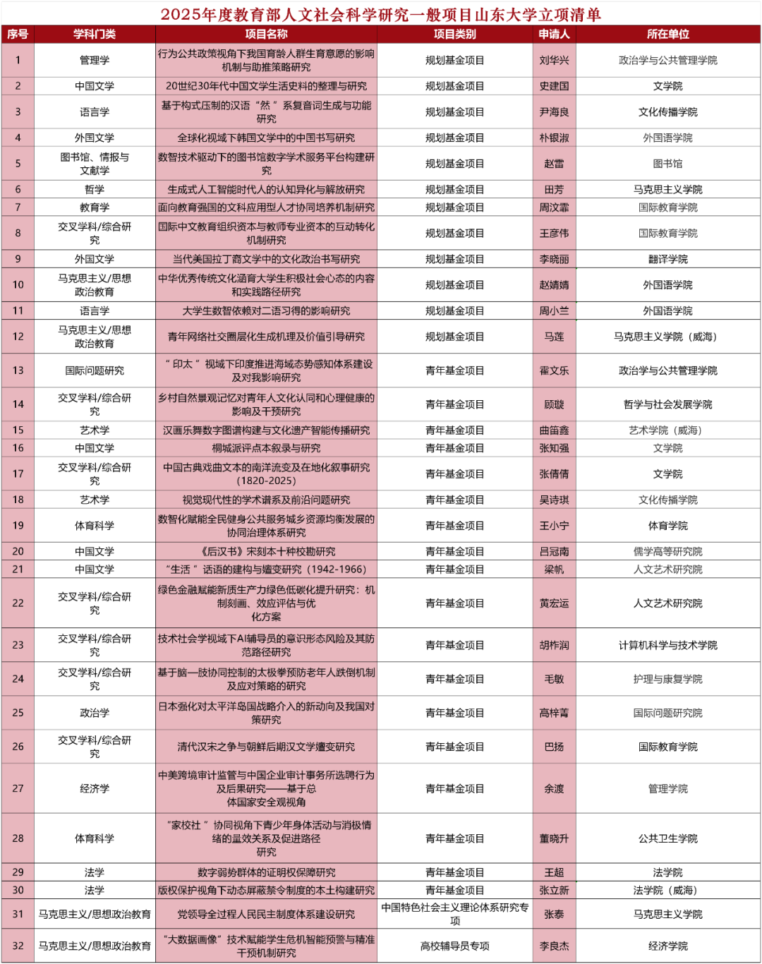 近日,教育部社会科学司公布2025年度教育部人文社会科学研究一般项目立项结果,山东大学共获批32项。在规划基金、青年基金、自筹经费项目,西部和边疆地区项目,新疆项目,西藏项目立项结果中,山大获批30项,立项数位列全国高校并列第一,连续三年居全国首位。