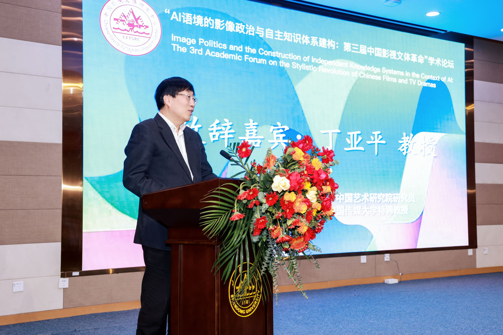 丁亚平教授认为本届论坛及时回应了影像技术的加速演进,并指向中国影视研究以何种方式继续保持独立性、创造性思考的深远命题。他希望论坛能够融合开放的影视文体革命思维,让学术思考在技术浪潮裹挟下,依然保持清醒的判断、必要的深度和应有的方向。在主旨演讲中,丁亚平提出在跨媒介生态中,影视文体正经历着从统一编码到离散生成的深刻变革。创作主体从编导扩展到算法、平台和用户构成的网络,意义生产从封闭结构走向开放生成。真正的文体革命不在于技术的更迭,而在于我们能否在算法时代保持对权力结构的警觉,开辟出具有批判性的创作空间。