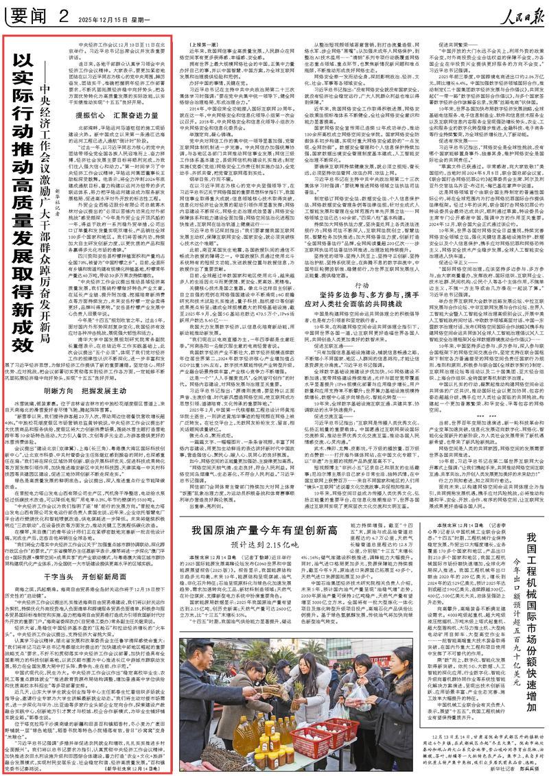 连日来,各地干部群众认真学习领会中央经济工作会议精神。大家表示,要更加紧密地团结在以习近平同志为核心的党中央周围,踔厉奋发、团结实干,准确把握明年经济工作部署要求,不断巩固拓展经济稳中向好势头,把各方面优势转化为高质量发展的实际效能,以实干实绩推动实现“十五五”良好开局。