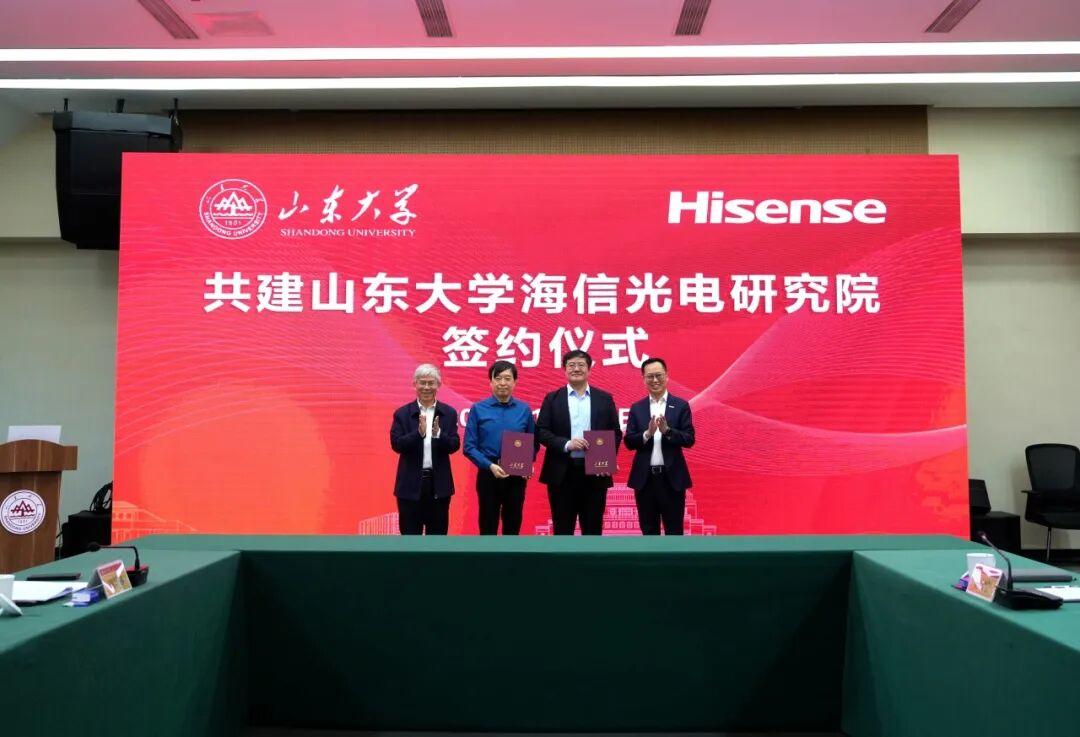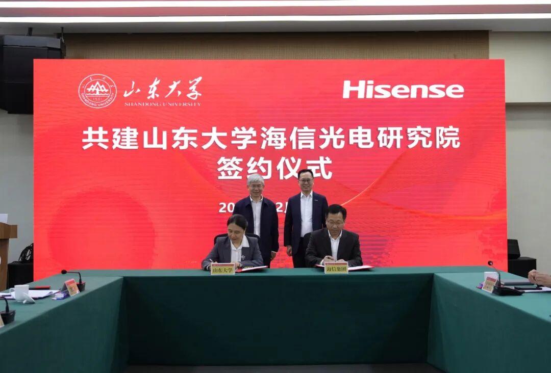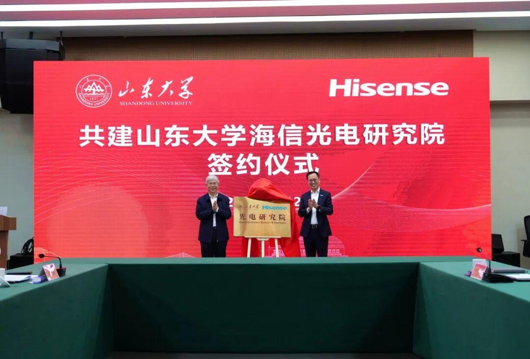12月12日,山东大学海信光电研究院揭牌仪式在青岛校区举行。山东大学校长李术才,海信集团党委书记、董事长贾少谦出席仪式并致辞。山东大学副校长、青岛校区校长王美琴,海信集团副总裁、海信视像科技总裁李炜参加活动。