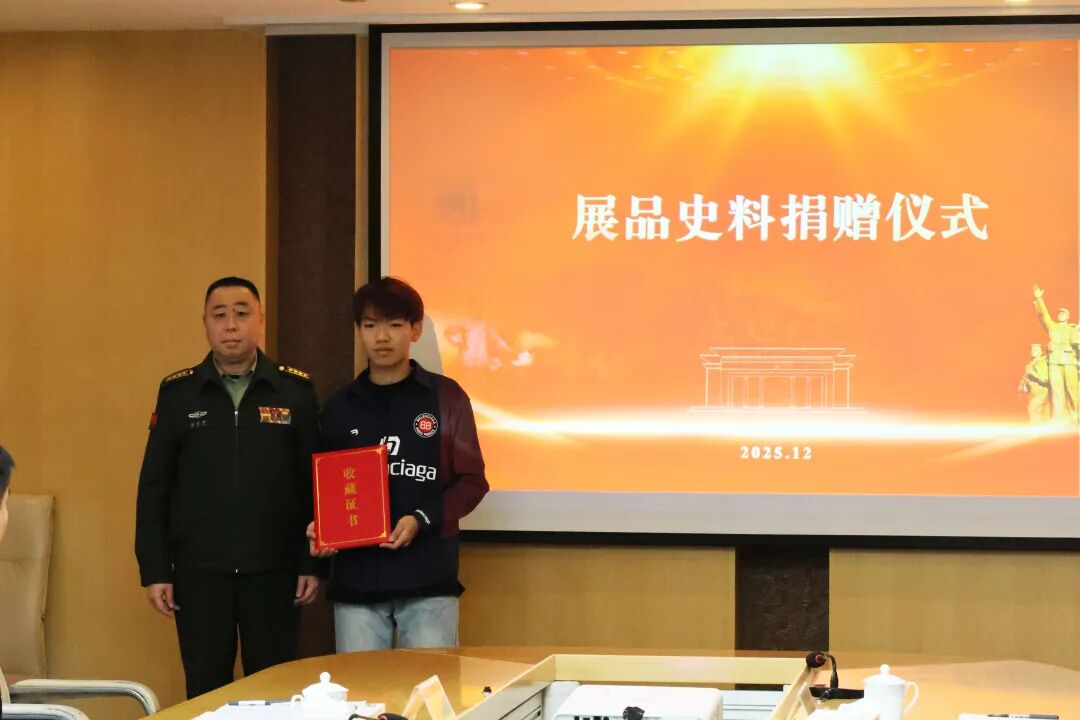 捐赠仪式上,省军区工作人员宣读了致李想同学的感谢信,对他的无私之举给予高度赞扬。李想与山东革命军事馆工作人员郑重签订展品交接书,相关领导为其颁发捐赠证书。“我的家乡虎头镇作为第二次世界大战终结地,烽火记忆早已融入成长血脉。跟随父亲走访各地搜集史料的经历,让我深知每一件历史物证的珍贵。能为革命军事馆建设贡献一份力量,让更多人铭记历史,我倍感荣幸。”李想道出了自己的初心。