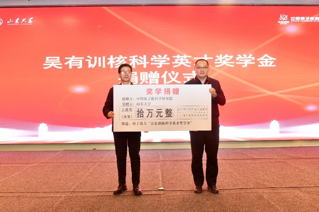 陈宏伟代表山东大学接受吴有训核科学英才奖学金捐赠。中国科学院院士、中国原子能科学研究院研究员张焕乔,国家自然科学基金委数理学部原常务副主任汲培文为2025年吴有训核科学英才奖学金获得者颁发证书。中国科学院院士、复旦大学副校长马余刚,中国科学院院士、清华大学教授邹冰松分别为2023级和2024级吴有训核科学英才班授班旗。中国科学院院士、中国原子能科学研究院研究员、南方科技大学讲席教授柳卫平,中国科学院院士、山东大学讲席教授梁作堂,欧洲科学院外籍院士、北京大学讲席教授孟杰共同为吴有训核科学英才班工作组组长、副组长颁发聘书。