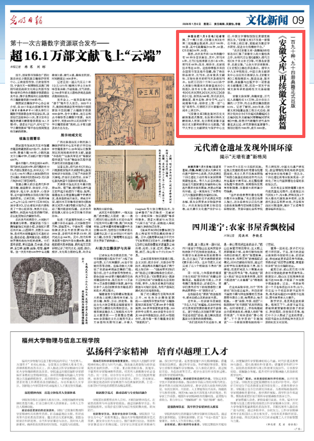日前,《安徽文库》发布第二批编纂出版成果,共计190种、94册,其中《典籍编》156种、64册,《方志编》34种、30册。