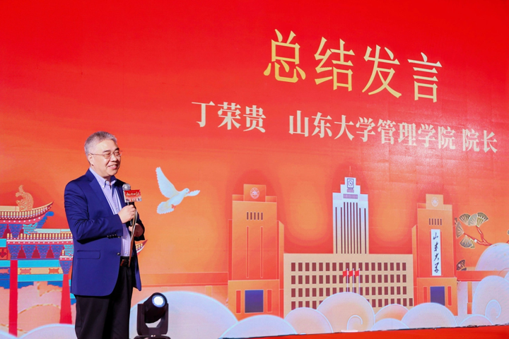 丁荣贵院长为盛典论坛环节作总结发言,深刻阐述了管理学院在新时代背景下的定位转型与使命担当。他指出,学院正从传统“象牙塔”式的教书育人组织,积极转型为深度参与社会经济发展的开放平台,将以“成为最懂文化、最能担当、最讲情义的管理学院”为组织愿景,通过系统性的角色重塑与文化筑基,重新定义自身价值:一、成为区域内最有影响力的人才与智力平台;二、成为广大校友及企事业单位事业发展的催化剂;三、成为社会各界整合资源、链接价值的中间枢纽。