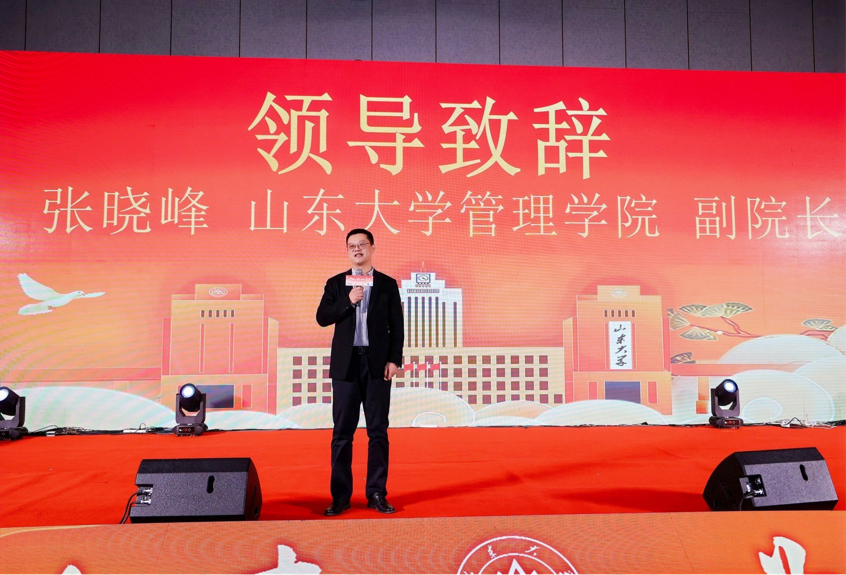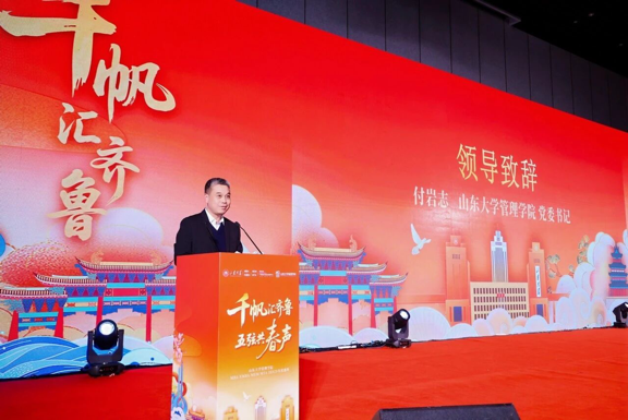 付岩志书记作开场致辞。他首先向所有远道而归的校友、孜孜以求的学子以及长期关心支持学院发展的各界伙伴,表示了热烈地欢迎与诚挚地感谢。同时回顾了过去一年学院在学科建设、人才培养、社会服务等方面取得的扎实进展,并强调,管理学院始终是全体校友和师生坚实的精神家园与发展后盾。他表示,山大学子在各自领域建功立业,最终汇聚成推动齐鲁乃至国家发展的磅礴力量,学院复合型育人项目与所有师生校友如五弦共鸣,共同奏响新时代的奋进强音。最后勉励大家在此盛典中:“既汲取前沿思想的养料,也重温同窗深厚的情谊,更凝聚起携手前行、共担使命的共识与力量。”