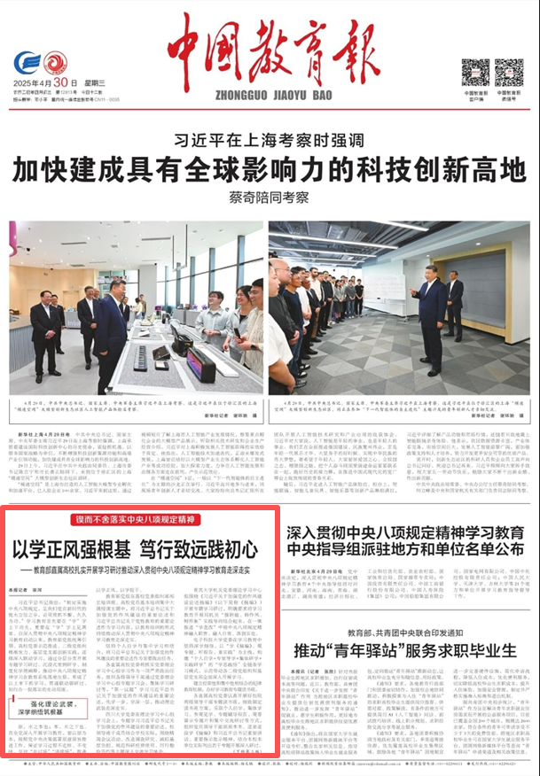 习近平总书记指出:“制定实施中央八项规定,是我们党在新时代的徙木立信之举,必须常抓不懈、久久为功。”学习教育首先要在“学”字上下功夫,更要在“学”字上见真章。自深入贯彻中央八项规定精神学习教育启动以来,教育部党组统筹引领、高校党委示范推进、二级党组织精准发力、基层党支部创新实践,逐级深入联动学习,通过分层分类开展专题学习研讨、沉浸式案例研学、制度化学理阐释,推动中央八项规定精神学习在教育系统落地生根,形成了以上率下抓学习、贯通联动强研讨、知行合一促落实的生动局面。