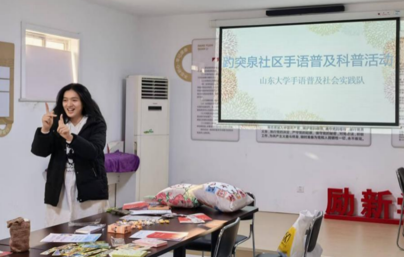 随着培训结束,实践队在趵突泉社区党群服务中心设置了手语普及展台,以“微课堂+互动体验”的形式展开活动。孙文瑞结合团队自编的《常用手语手册》,现场讲解并演示了16个日常生活高频手语,涵盖问候、致谢、求助等场景。何秉睿通过细致教学26个字母的手语表达方式,引导参与者尝试拼写自己名字、完成简单自我介绍,让手语从“看得懂”到“用得上”,并通过手语传意猜猜看、无声唇语挑战、手语展示等特殊环节巩固了手语记忆。展台前气氛热烈,不少参与者表示,活动打破了他们对手语的陌生感,从而意识到手语不只是手势,更是表情和肢体相互协调的“立体”语言。