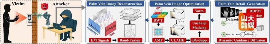 该研究创新性地提出了一种名为VeinPhantom的新型侧信道攻击方法,被通信网络领域国际顶级学术会议INFOCOM 2026录用。其核心思想是:攻击者通过在非接触、非侵入条件下捕获皮下静脉成像传感器无意中泄露的电磁辐射信号,并结合信号处理与重建算法,即可恢复出具有判别能力的掌静脉图像,进而实现对生物特征认证系统的欺骗攻击。实验结果表明,VeinPhantom对当前最先进的认证系统的欺骗成功率最高可达56.96%,系统性揭示了生物识别技术在电磁信息安全方面的新风险。