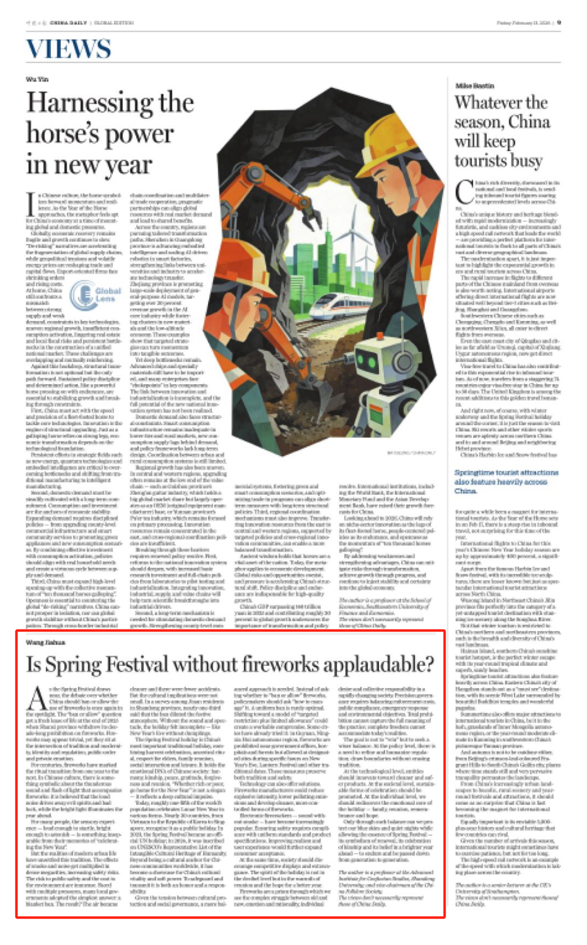 Only through such balance can we protect our blue skies and quiet nights while allowing the essence of Spring Festival — its symbolism of renewal, its celebration of kinship and its belief in a brighter year ahead — to endure and be passed down from generation to generation.