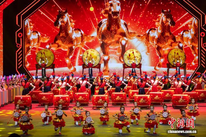 2月14日,山东济宁,2026山东省机器人春节晚会演出现场,机器人与手持小鼓的孩子们组成一支“人机鼓队”。李茁 摄